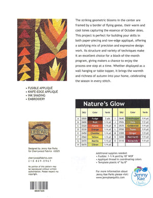 Designed by Jenny Kae Parks for the Cherrywood Woodland Garden Collection. The striking geometric blooms in the center are framed by a border of flying geese, their warm and cool tones capturing the essence of October skies. This project incorporates paper-piecing, traditional piecing, and raw-edge appliqué.  Display this beautiful quilt as a wall hanging or table topper to celebrat the season. Finished quilt is 40" x 40".
