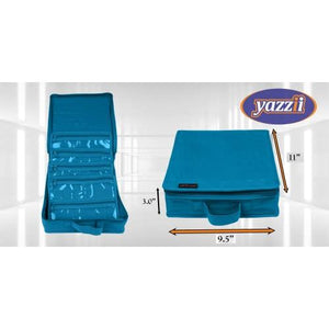 The Yazzii Blue craft box features two compartments: one with 4 detachable pockets for small items like scissors and pins, and another for larger items, ensuring everything is neatly organised. Equipped with a fabric top, this craft box invites personal embellishment, allowing you to add a personal touch to your organiser, making it uniquely yours. Perfect for quilting, needlework, beading, and more, this organizer supports a wide range of craft activities by keeping essential tools and materials at your fingertips. Dual zippers and a sturdy design ensure your crafting supplies are securely stored and easily portable, making it ideal for both home use and travel. Size when closed: 11 inches x 9.5 inches x 3 inches, providing ample space while maintaining a compact and easy-to-handle form.
