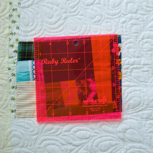 Most of us do not have as much space on our cutting tables as we would like so a tool that does two jobs is always welcome! Use the 5in square acrylic quilting ruler for rotary cutting and also for viewing your fabric scraps with an artist's eye to cancel out color and focus on value.