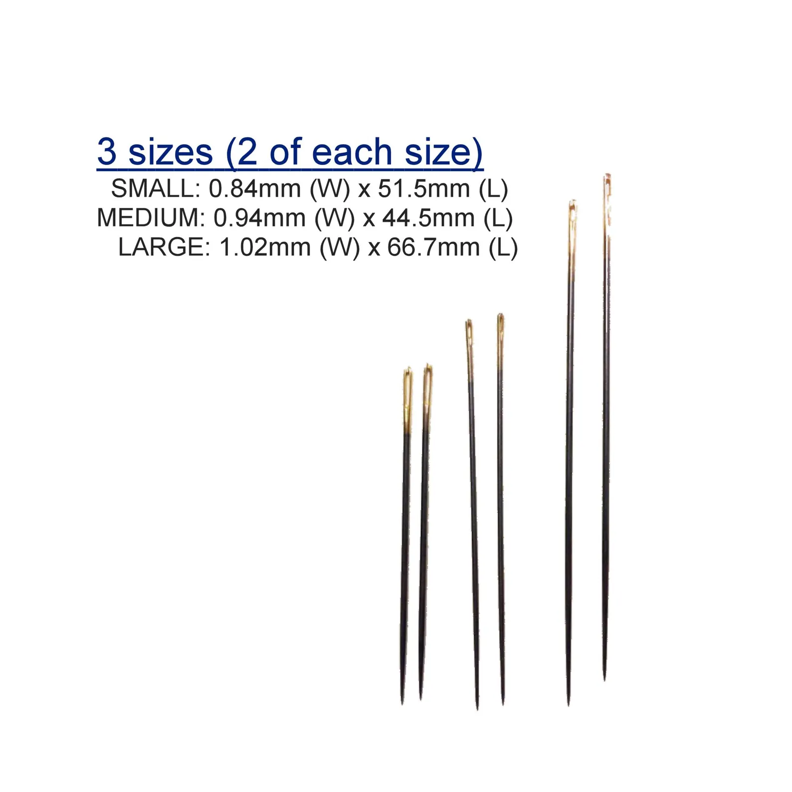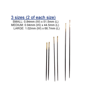 Hiroshima Tulip needles made in Japan. These needles are polished lengthwise to ensure smooth fabric piercing. The needles have a large needle eye and are flexible and resist warping. The tube ontains 6 Needles 2 each of three different sizes.